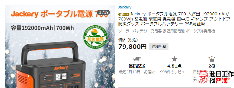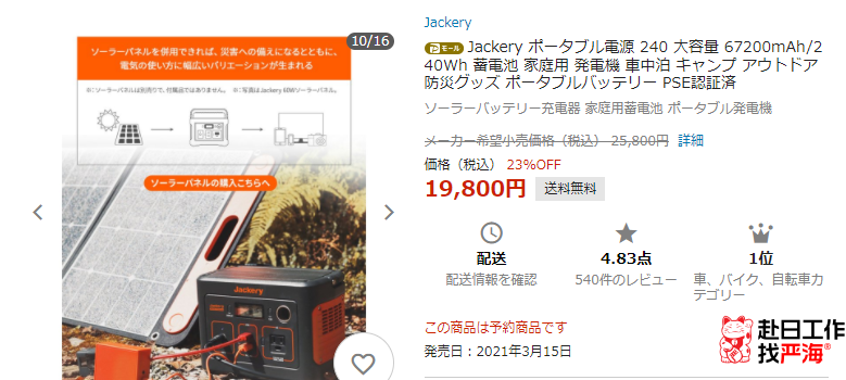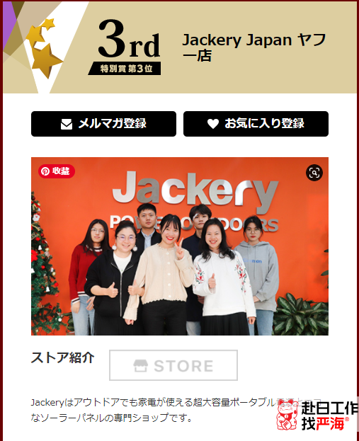 主營產(chǎn)品是可在戶外使用的超大容量便攜式電源和環(huán)保型太陽能電池板。【Jackery Japan ヤフー店】可以說是所有獲獎店鋪中產(chǎn)品數(shù)量最少的店鋪了。整個店鋪總共12件產(chǎn)品。店鋪銷量第一的便攜式電源540條評論平均分4.83,銷量第二998條評論平均分4.81,可想而知【Jackery Japan ヤフー店】的產(chǎn)品是非常優(yōu)秀了。在日本人眼中東西好只值3.5分,4.5分以上是產(chǎn)品超出預(yù)期的優(yōu)秀了。