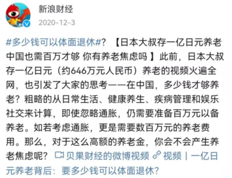 前不久,日本一位大叔存一億日元(約646萬元人民幣)養老的視頻火遍全網,也引發了大家的思考。