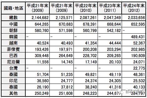 按國家/地區分類在留資格外國人口數據。來源:法務省