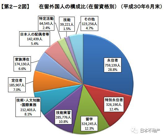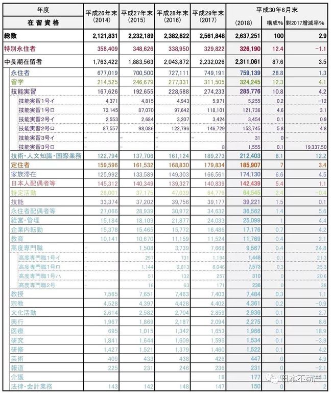在下表中,讓我們解讀數據以了解居住在日本的外國人的在留資格和居住身份。以下有幾個關鍵的要點:在官方數據中,居住在日本的“外國人”的絕大多數人具有永久或長期居留身份,其中六成外國人是以下五大類:永住者丶特別永住者丶定住者丶家族滯在丶日本人的配偶者。“永住者”(eijyuusha丶えいじゅうしゃ)日本的永久居民(759,139人,占總數的28.8%)。擁有永住者資格(永住權)的外國人可以永久住在日本,在日本可以從事的活動(例如工作)與日本人相同丶不受簽證種類限制丶在留期間不需更新。因此可以更容易地申請日本銀行的貸款。“特別永住者“(tokubetsueijūsha丶とくべつえいじゅうしゃ)特別永久居民(326,190人,占總數的12.4%)。主要對象大多為在日朝鮮人?在日韓國人?在日臺灣人以及其子孫。歷史可以追朔到第二次世界大戰,來自日本殖民統治的殖民地(韓國或臺灣)的人民在當時雖然被視同日本國民并享有日本國籍,但隨著日本戰敗後,來自上述前殖民地的人民以及其子孫失去了日本國籍,為了使這些已定居在日本的人民得以繼續住在日本,給予其特別永住者身份。“定住者”(teijyuusha丶ていじゅうしゃ)長期居民(185,907人,占總數的7.0%)。主要對象為日系人(在日本以外國家有永久居民身份的日本人)及其配偶丶印尼難民丶喪失日本人或特別永住者配偶的外國人丶日本人的外國籍未婚子女等。與永住者一樣不受在日本可以從事的活動(例如工作)與日本人相同丶不受簽證種類限制。但是在留期間必須更新,大多為一年或三年。約五分之一的外國人在日本念書或實習。留學生(在留資格為“留學”)共324,245人,占總數的12.3%。實習生(在留資格為“技能實習”)人共285,776人,占總數的10.8%。這兩個類別共占日本外國人總數的五分之一。在日本工作的外國人最多的在留資格是(按在留資格的百分比計算)是“技術?人文知識?國際業務“。持有此類的在留資格者被定義為“具備法學丶經濟學丶社會學或其他人文科學領域相關知識,并從事與上述知識相關領域的活動或工作”。從事這些活動必須基於與日本公家機關或民間企業之間的工作合約,包括:例如:口譯丶翻譯丶企劃文案丶時裝設計丶室內設計丶銷售丶海外業務,資訊處理丶國際金融丶設計或公共關系以及廣告等。值得注意的是,為了緩減日本人才不足的情況和吸引更多擁有高度專門技能人材,日本政府新增設了以下三類在留資格:2015年新增“高度專門職”(高度人才簽證)丶2017年新增“介護”以及“技能實習3號イ?ロ”。因此,此三類在留資格於2018年6月末對照2017年年末,有超過20%的大幅增長率。此三項在留資格的在留期間最長可達到5年。其中,“高度專門職”(高度人才簽證)由於「學歷」丶「職務經歷」丶「年収」累積積分達70分即可申請,并且可享較多的優惠制度(例如:工作累積1年或3年即可申請成為永住者),因此許多原本持“技術?人文知識?國際業務“的外國人也在此在留資格實施後陸續變更在留資格。